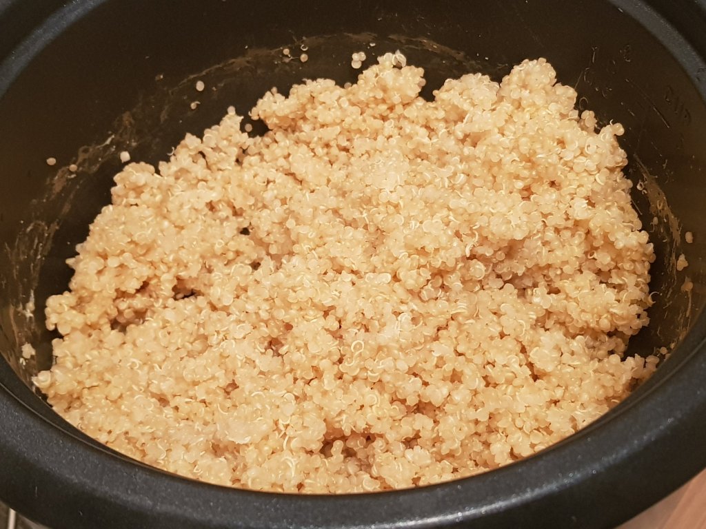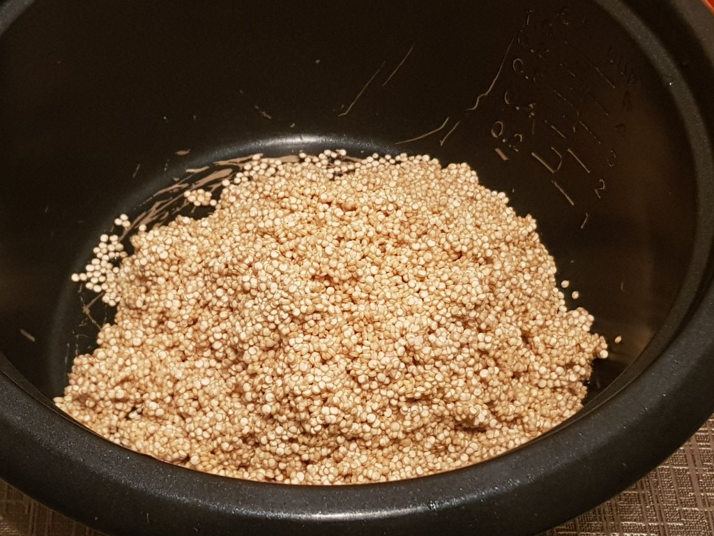 2. In an old-fashioned Asian way, I used my rice cooker. I put the quinoa in it, along with 1 3/4 cup of water and 1tsp of salt.