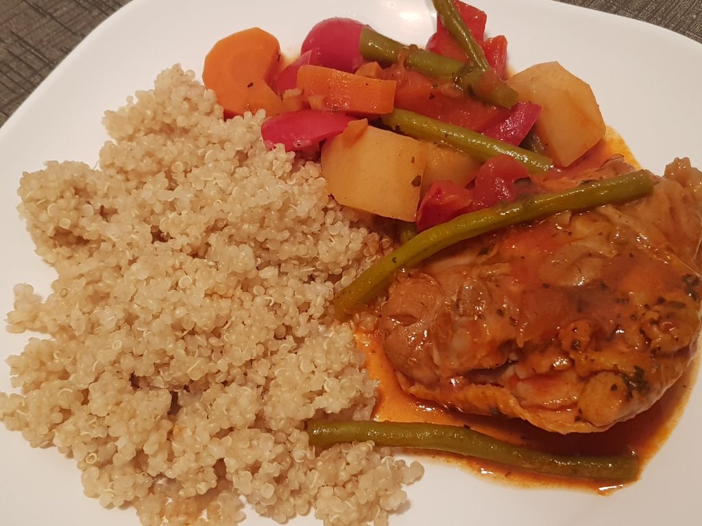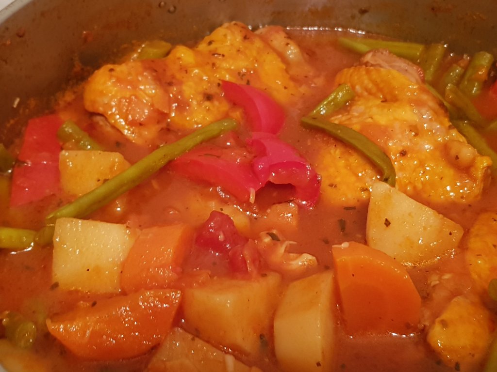To start with, Chicken Afritada is a Filipino chicken stew cooked in tomato sauce, with carrots, potatoes and bell pepper.